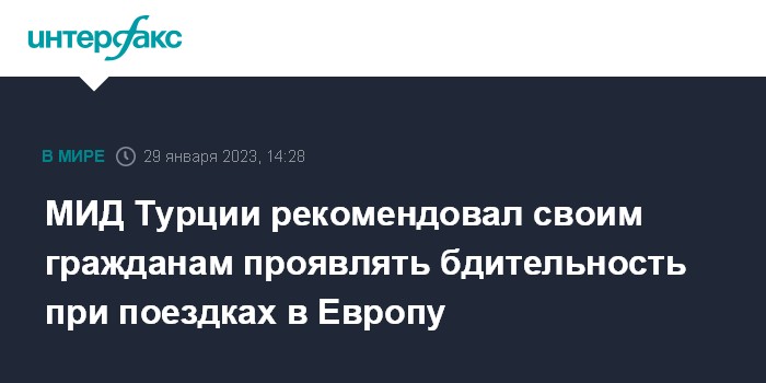 Москва. 29 января. INTERFAX.RU - МИД Турции выпустил предупреждение для граждан страны, призвав их к большей бдительности при поездках в страны Европы, сообщает в воскресенье Associated Press.