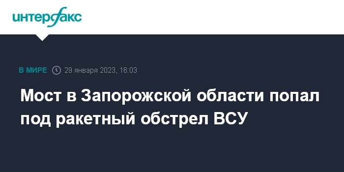 Москва. 29 января. INTERFAX.RU - Вооруженные силы Украины нанесли в воскресенье ракетный удар по автомобильному мосту через реку в Мелитопольском районе Запорожской области, есть погибшие и раненые, сообщил председатель регионального общественного объединения "Мы вместе с Россией" Владимир Рогов.