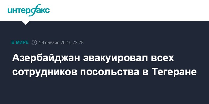 Москва. 29 января. INTERFAX.RU - Самолет с эвакуированными из Тегерана сотрудниками посольства Азербайджана в Иране и членами их семей в воскресенье вечером приземлился в Баку.