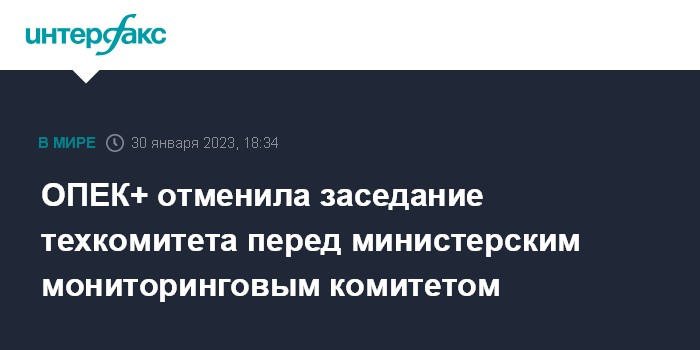 Москва. 30 января. INTERFAX.RU - ОПЕК+ отменила заседание технического комитета, обычно предшествующего встрече министров мониторингового комитета (JMMC), сообщили "Интерфаксу" несколько источников, знакомых с ситуацией.