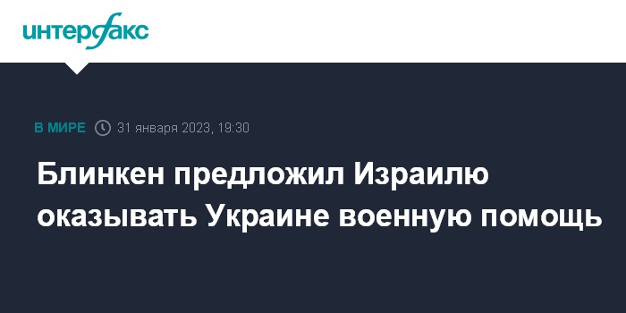 Москва. 31 января. INTERFAX.RU - Госсекретарь США Энтони Блинкен в ходе переговоров с властями Израиля убеждал их в том, чтобы израильская сторона помогала Украине не только в гуманитарной области, но и в военной.