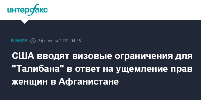 Москва. 2 февраля. INTERFAX.RU - Госсекретарь США Энтони Блинкен заявил о введении дополнительных визовых ограничений в отношении членов движения "Талибан" (запрещенная в РФ террористическая организация) в связи дискриминационными решениями в отношении афганских женщин, сообщил американский госдепартамент.