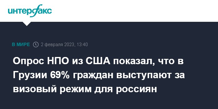 Москва. 2 февраля. INTERFAX.RU - Большинство опрошенных в Грузии граждан выступают за введение визового режима для россиян, утверждает американская неправительственная организация "Национальный демократический институт" (NDI), представительство которой в Грузии опубликовало в четверг результаты опроса, проведенного в стране в декабре прошлого года.