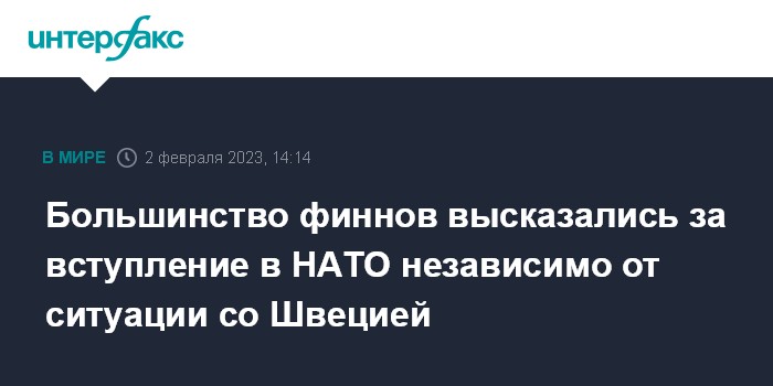 Москва. 2 февраля. INTERFAX.RU - Большинство опрошенных финнов считают необходимым продолжать процедуру вступления Финляндии в НАТО, не дожидаясь Швеции, сообщают в четверг западные СМИ со ссылкой опрос общественного мнения компании Taloustutkimus.