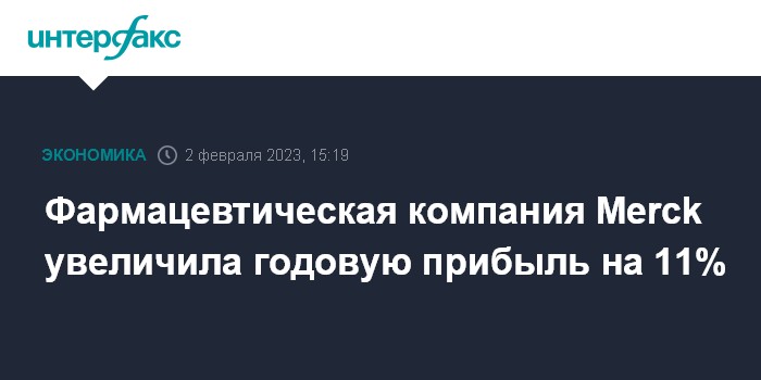 Москва. 2 февраля. INTERFAX.RU - Американская фармацевтическая компания Merck & Co. в 2022 году увеличила чистую прибыль на 11%, до $14,52 млрд, прибыль без учета разовых факторов выросла на 39%, до $7,48 на акцию. Годовая выручка компании повысилась на 22%, до $59,3 млрд.