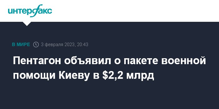 Москва. 3 февраля. INTERFAX.RU - Пентагон объявил об очередном транше военной помощи Украине стоимостью $2,2 млрд, сообщают американские СМИ.