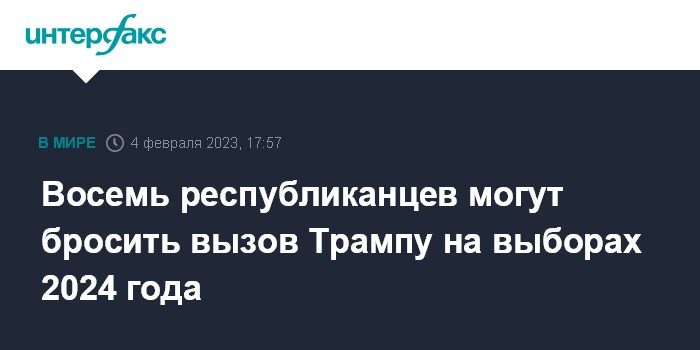 Москва. 4 февраля. INTERFAX.RU - По меньшей мере восемь видных представителей Республиканской партии США могут бросить вызов на праймериз экс-президенту США Дональду Трампу, который к настоящему моменту - единственный политик из партии, объявивший о намерении участвовать в выборах президента, пишет в субботу газета The Hill.