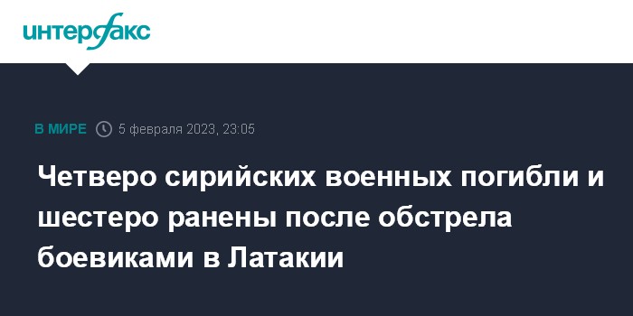 Москва. 5 февраля. INTERFAX.RU - Четверо сирийских военнослужащих погибли и шестеро ранены в результате обстрела боевиками позиций правительственных сил в провинции Латакия, сообщил на брифинге в воскресенье заместитель руководителя российского Центра по примирению враждующих сторон (ЦПВС) в Сирийской Арабской Республике генерал-майор Олег Егоров.