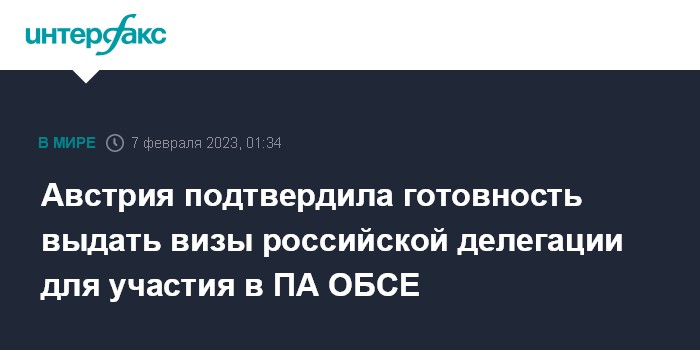Москва. 7 февраля. INTERFAX.RU - Пресс-секретарь МИД Австрии Антония Праун сообщила о готовности ее страны выдать ограниченное количество виз российской делегации для участия в сессии Парламентской ассамблеи ОБСЕ в Вене 23-24 февраля, пишет издание Foreign Policy.