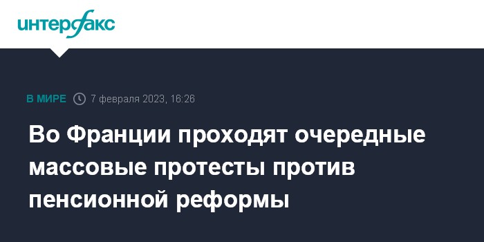 Москва. 7 февраля. INTERFAX.RU - Очередная волна акций протеста против планируемой правительством пенсионной реформы проходит во вторник во Франции, сообщают французские СМИ.