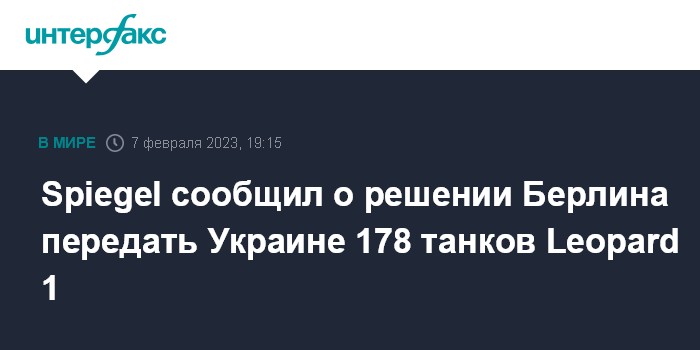 Москва. 7 февраля. INTERFAX.RU - Власти Германии дали согласие на передачу Украине 178 танков Leopard 1, сообщает во вторник журнал Spiegel со ссылкой на свои источники.
