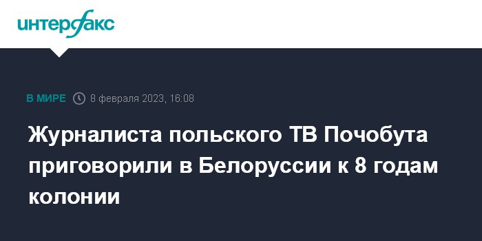 Москва. 8 февраля. INTERFAX.RU - Гродненский областной суд в среду приговорил журналиста международного канала общественного телевидения Республики Польши Polonia, активиста Союза поляков Белоруссии Анджея Почобута к восьми годам колонии усиленного режима, сообщает пресс-служба Верховного суда Белоруссии.