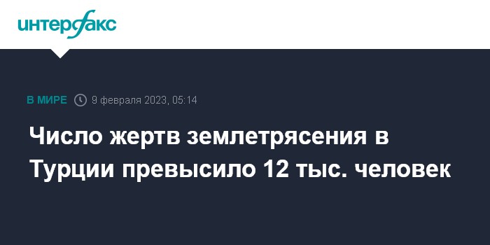 Москва. 9 февраля. INTERFAX.RU - Число погибших в результате землетрясения в Турции превысило 12 тыс. человек, ранены почти 63 тыс., сообщило агентство Anadolu в четверг.