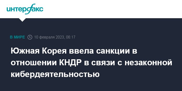 Москва. 10 февраля. INTERFAX.RU - Южная Корея в пятницу объявила о введении санкций в отношении четырех физлиц и семи организаций из Северной Кореи в ответ на незаконные действия в киберпространстве.