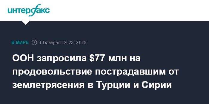 Москва. 10 февраля. INTERFAX.RU - Всемирная продовольственная программа (WFP) ООН в пятницу запросила $77 млн для обеспечения продовольствием людей, пострадавших от мощного землетрясения в Турции и Сирии.