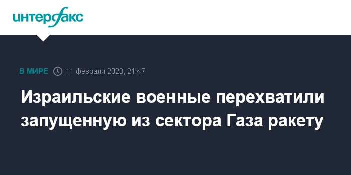 Москва. 11 февраля. INTERFAX.RU - Ракета, запущенная из сектора Газа по югу Израиля в субботу вечером, была перехвачена системой противовоздушной обороны (ПВО) "Железный купол", сообщает Times of Israel со ссылкой на израильских военных.