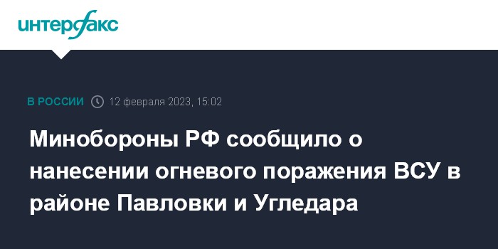 Москва. 12 февраля. INTERFAX.RU - Российские военные нанесли комплексное огневое поражение подразделениям армии Украины в районе населенных пунктов Павловка и Угледар в ДНР, заявили в воскресенье в Минобороны РФ.