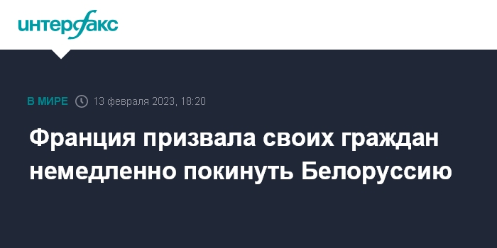 Москва. 13 февраля. INTERFAX.RU - МИД Франции призвал сограждан немедленно покинуть Белоруссию, говорится в обращении на сайте ведомства.