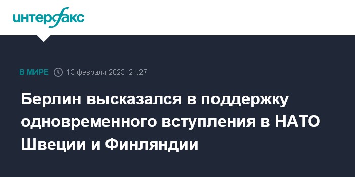 Москва. 13 февраля. INTERFAX.RU - Вступление Финляндии и Швеции в НАТО только укрепит альянс, Германия поддерживает одновременное вхождение этих стран в организацию, заявила на пресс-конференции в Хельсинки министр иностранных дел Германии Анналена Бербок.