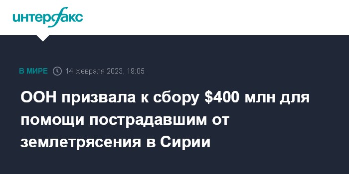 "Генсек Антониу Гутерриш объявил, что ООН обращается с призывом о сборе $397 млн для гуманитарной помощи людям в опустошенной от землетрясения Сирии", - говорится в твиттере пресс-службы генсека.