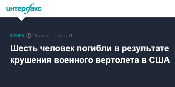 Москва. 16 февраля. INTERFAX.RU - Военный вертолет потерпел крушение на оживленном шоссе недалеко от Хантсвилла (штат Алабама), шесть человек погибли, сообщают американские СМИ.