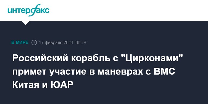 Москва. 17 февраля. INTERFAX.RU - Российский фрегат "Адмирал Горшков", оснащенный новыми гиперзвуковыми ракетами "Циркон", как ожидается, 17-27 февраля примет участие в совместных учениях с кораблями военно-морских сил (ВМС) Китая и Южно-Африканской республики.