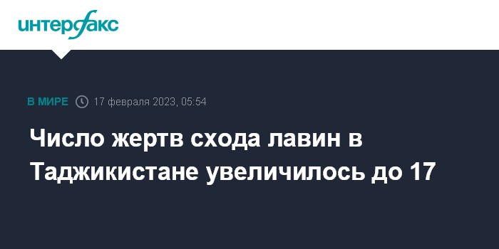 Москва. 17 февраля. INTERFAX.RU - В результате схода лавин в Таджикистане погибли 17 человек, продолжаются поиски двух студенток, сообщает пресс-центр КЧС республики.