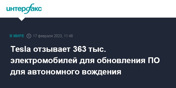 Москва. 17 февраля. INTERFAX.RU - Tesla Inc. отзывает почти 363 тыс. электромобилей для обновления программного обеспечения, поддерживающего функцию автономного вождения.