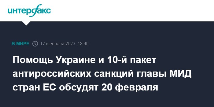 Помощь Украине и 10-й пакет антироссийских санкций главы МИД стран ЕС обсудят 20 февраля