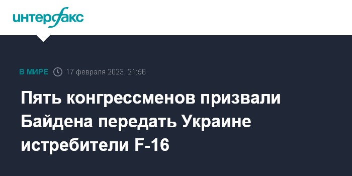 Москва. 17 февраля. INTERFAX.RU - Несколько конгрессменов от Республиканской и Демократической партий США призвали президента страны Джо Байдена передать Украине истребители F-16, пишет Politico со ссылкой на письмо этих пяти членов Палаты представителей Конгресса.
