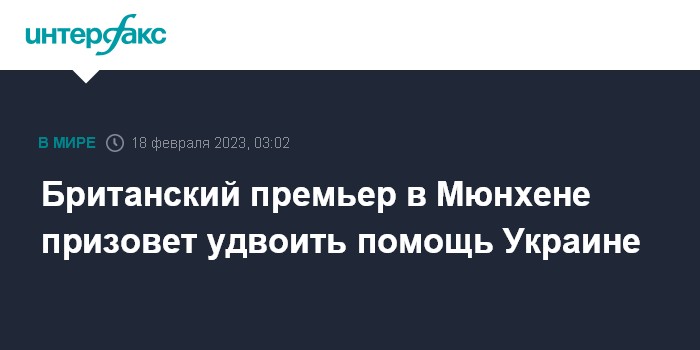 Москва. 18 февраля. INTERFAX.RU - С призывом удвоить военную помощь Украине выступит на Мюнхенской конференции по безопасности в субботу премьер-министр Великобритании Риши Сунак, сообщила канцелярия премьера, публикуя выдержки из его выступления.