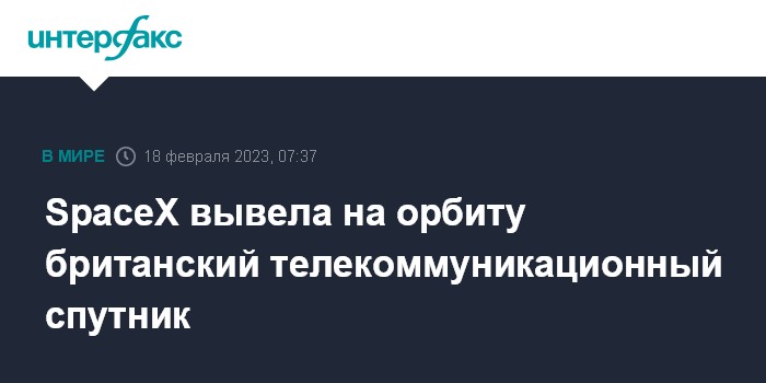 Москва. 18 февраля. INTERFAX.RU - Американская ракета Falcon 9 в субботу успешно вывела на орбиту британский телекоммуникационный спутник Inmarsat-6 F2, сообщила компания-разработчик носителя SpaceX.