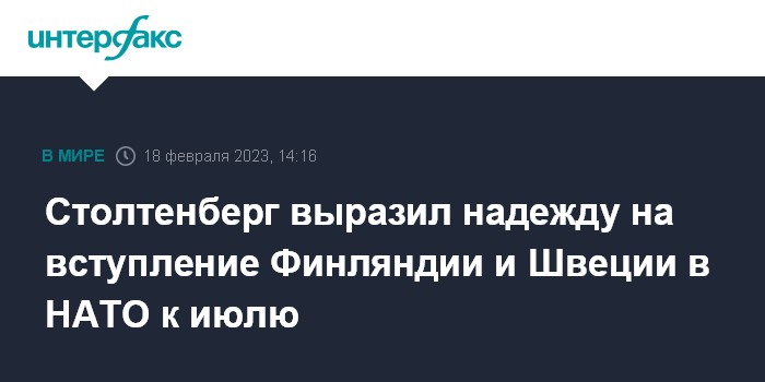 Москва. 18 февраля. INTERFAX.RU - Генсек НАТО Йенс Столтенберг заявил, что надеется на завершение процесса вступления Финляндии и Швеции в альянс к июльскому саммиту НАТО в Вильнюсе.