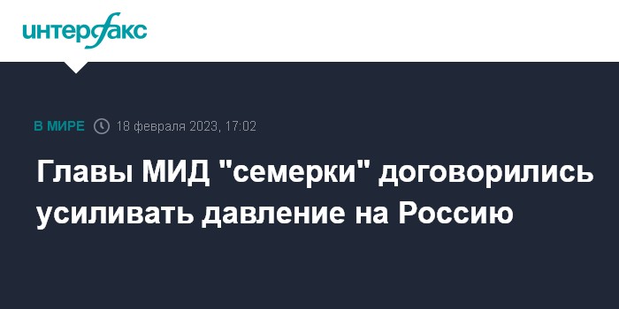 Москва. 18 февраля. INTERFAX.RU - Страны G7 договорились сохранять санкции против России из-за Украины и усиливать санкционное давление на нее, говорится в заявлении глав МИД государств "семерки", распространенном по итогам встреч на полях Мюнхенской конференции по безопасности.