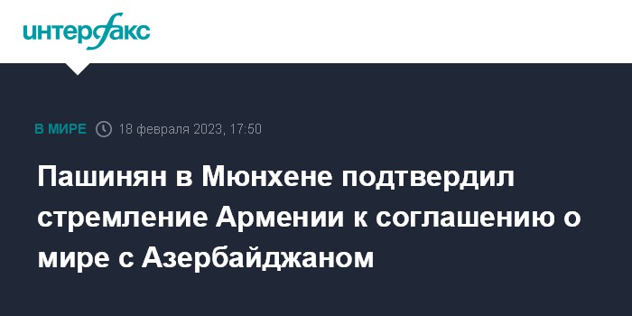 Москва. 18 февраля. INTERFAX.RU - Премьер-министр Армении Никол Пашинян на встрече с президентом Азербайджана Ильхамом Алиевым и госсекретарем США Энтони Блинкеном в Мюнхене в субботу подтвердил готовность к подписанию соглашения между Ереваном и Баку, гарантирующего долгосрочный мир.