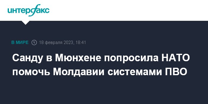 Москва. 18 февраля. INTERFAX.RU - Президент Молдавии Майя Санду на Мюнхенской конференции по безопасности попросила НАТО о помощи в приобретении систем противовоздушной обороны.