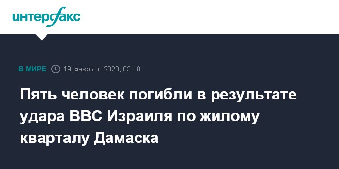 Москва. 19 февраля. INTERFAX.RU - Израильские ВВС поздно вечером в субботу нанесли удар по жилому району сирийской столицы, в результате погибли пять человек, сообщило сирийское государственное информационное агентство SANA.