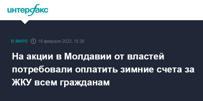 Москва. 19 февраля. INTERFAX.RU - В центре Кишинева проходит массовая акция протеста с требованием, чтобы власти оплатили счета за коммунальные услуги всем гражданам Молдавии за три зимних месяца.