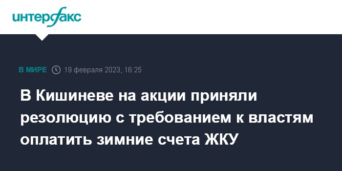 Москва. 19 февраля. INTERFAX.RU - Оппозиционный митинг протеста в центре Кишинева завершился принятием резолюции с требованием об оплате за счет бюджета счетов за коммунальные услуги гражданам.