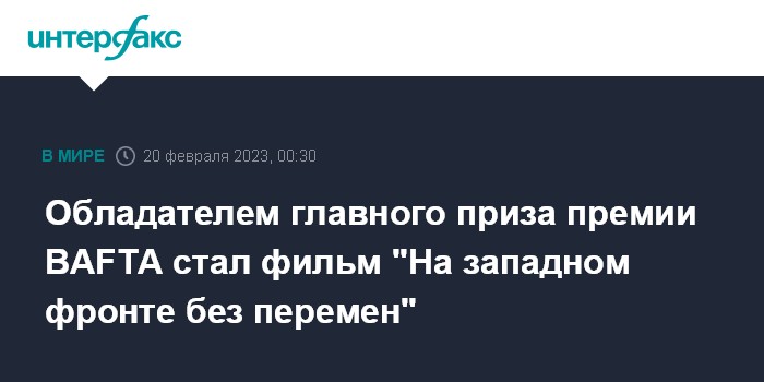 Москва. 20 февраля. INTERFAX.RU - Фильм "На западном фронте без перемен" режиссера Эдварда Бергера получил главную награду премии Британской академии кино и телевизионных искусств BAFTA.