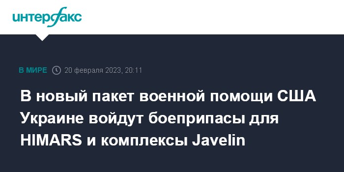 Москва. 20 февраля. INTERFAX.RU - Очередной пакет военной помощи США Украине на сумму в $460 млн включает в себя, в частности, боеприпасы для реактивных систем залпового огня (РСЗО) HIMARS и 155-миллметровые артиллерийские снаряды, сообщает The Washington Post со ссылкой на заявление Пентагона.