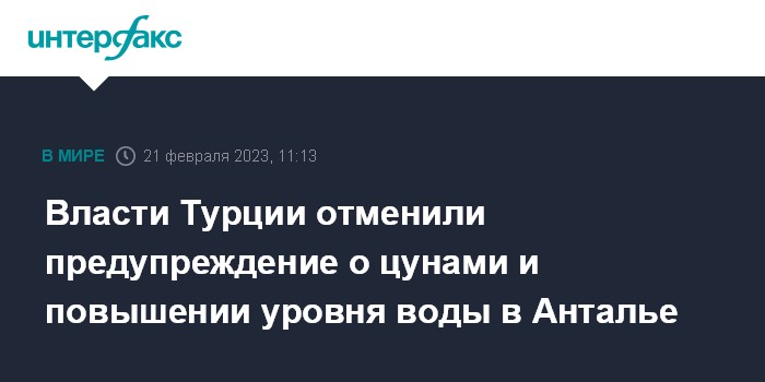 Москва. 21 февраля. INTERFAX.RU - Управление по устранению последствий катастроф и чрезвычайных ситуаций в Турции (AFAD) отменило предупреждение о повышении уровня моря и вероятности цунами в Анталье и Мерсине из-за землетрясения в провинции Хатай, сообщает во вторник издание TRT Haber.