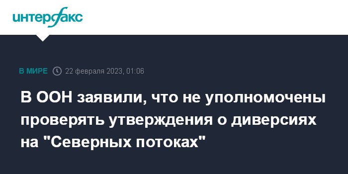 Москва. 22 февраля. INTERFAX.RU - ООН не уполномочена самостоятельно проверять заявления о случившемся на "Северных потоках", призывает избегать спекуляций, заявила замгенерального секретаря Организации по политическим вопросам Розмари Дикарло.