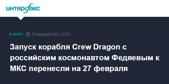 Москва. 22 февраля. INTERFAX.RU - Запуск американского пилотируемого корабля Crew Dragon с российским космонавтом Андреем Федяевым на борту к Международной космической станции (МКС) перенесен с 26 на 27 февраля, сообщило Национальное управление США по аэронавтике и исследованию космического пространства (NASA).