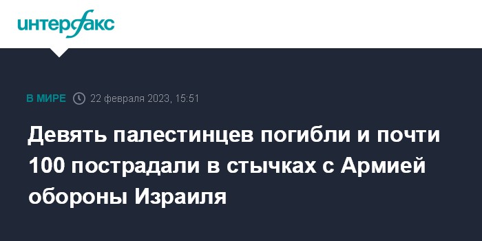 Москва. 22 февраля. INTERFAX.RU - Девять палестинцев погибли и 97 пострадали в столкновениях с военными Армии обороны Израиля (ЦАХАЛ) после рейда в городе Наблус на Западном берегу реки Иордан, сообщает в среду The Jerusalem Post.