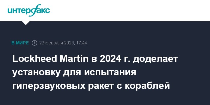 Москва. 22 февраля. INTERFAX.RU - Оборонная компания Lockheed Martin Corporation в 2024 году завершит создание установки для испытательных запусков разрабатываемых гиперзвуковых ракет морского базирования, сообщает в среду Defense news.