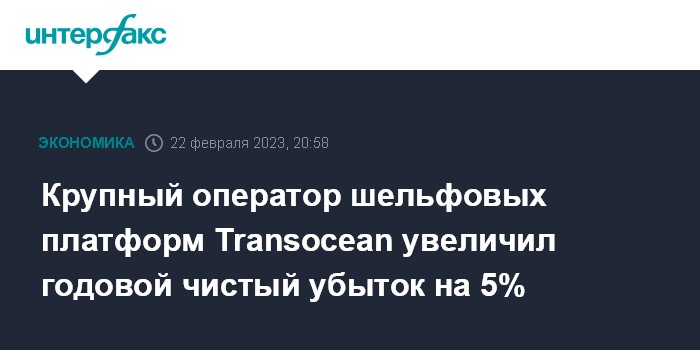 Москва. 22 февраля. INTERFAX.RU - Швейцарская Transocean Ltd., один из крупнейших операторов шельфовых нефтяных платформ в мире, завершила 2022 год с чистым убытком в размере $621 млн, или $0,89 в расчете на акцию.