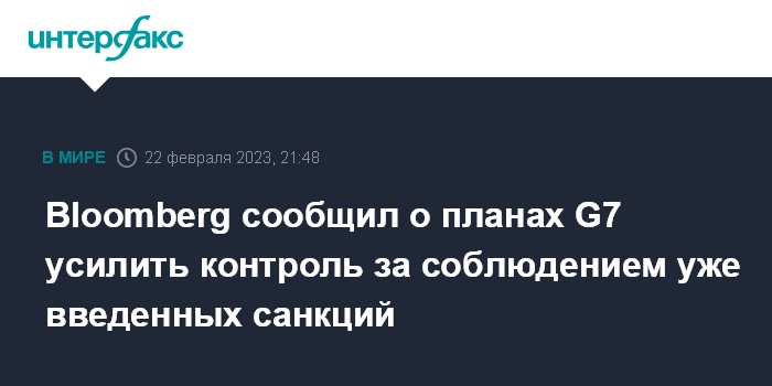 Москва. 22 февраля. INTERFAX.RU - Государства G7 намерены создать новый механизм для обеспечения соблюдения уже введенных в отношении России санкций, это должно повысить эффективность введенных ограничений, сообщает Bloomberg со ссылкой на источники.