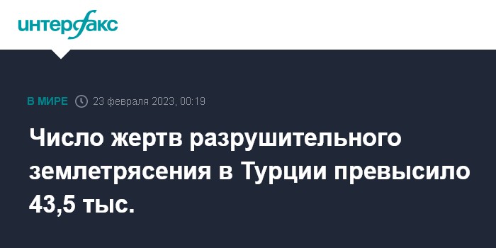 Число жертв разрушительного землетрясения в Турции превысило 43,5 тыс.