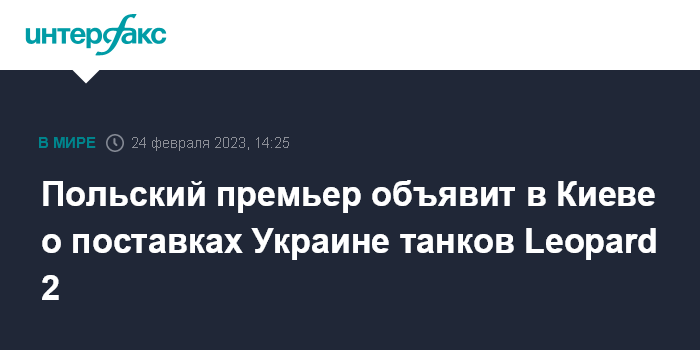 Москва. 24 февраля. INTERFAX.RU - Глава правительства Польши Матеуш Моравецкий, который находится в Киеве, как ожидается, объявит в пятницу, 24 февраля, о первых поставках танков Leopard 2 Украине, сообщает агентство ПАП со ссылкой на источники в польском правительстве.